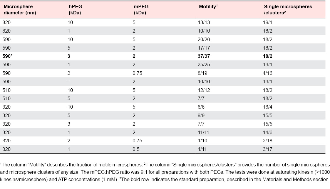 Table 2 shows that our protocol worked for a broad range of PEG lengths and microsphere sizes. For our experiments, not only the motility (fraction of motile microspheres) but also the amount of microsphere clustering was important. To this end, in a given field of view, we counted the ratio of single microspheres relative to clusters of any size. We found that a minimal length of mPEG with a molecular weight larger than 0.75 kDa was necessary to avoid clustering and ensure motility. Using our standard microspheres, we could reduce the amount of clustering compared to e.g. a NeutrAvidin-biotin linkage [