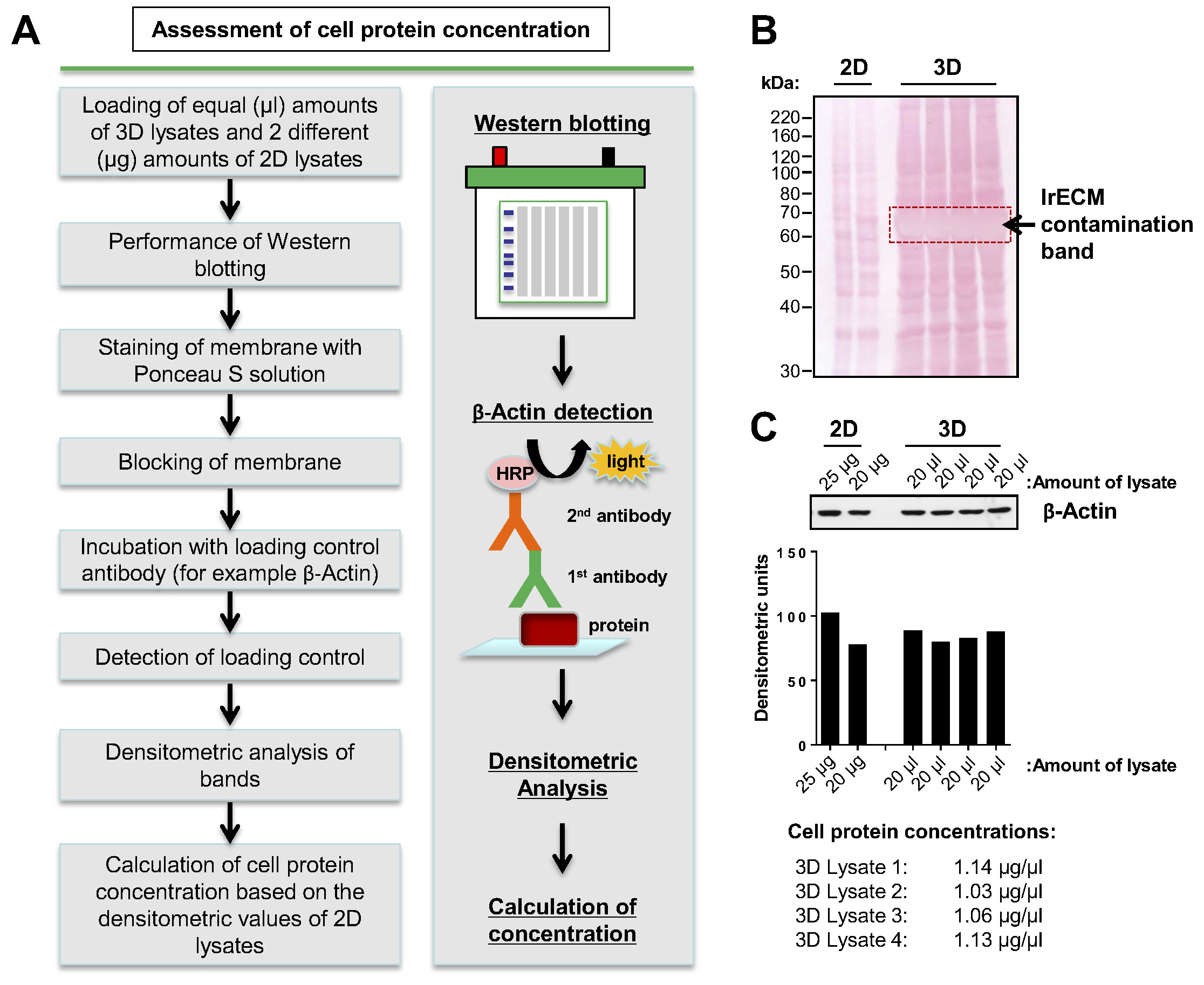 Figure 2. A. Work flow of protein estimation using western blotting. B. Representative image of a membrane containing 2D and 3D samples stained with Ponceau S. The contamination band of the remaining laminin-rich extracellular matrix (lrECM) is around 50–70 kDa. C. Detection of β-Actin and densitometric analysis are used to estimate cell protein concentrations.