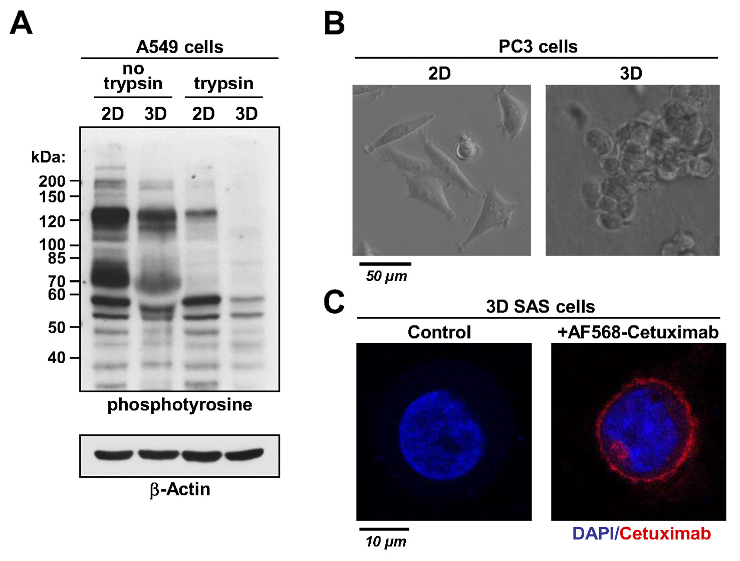 Figure 3. A. Western blot for phosphotyrosine in 2D and 3D A549 lung carcinoma cell cultures lysed either in adherent growing cells or suspension cells detached with trypsin. B. Representative images of 2D and 3D grown PC3 prostate carcinoma cells. C. Immunofluorescence staining of one SAS cell growing in 3D. Cells were incubated with fluorochrome-labeled Cetuximab for 30 min. An untreated cell is shown as control. The nucleus was stained with DAPI.