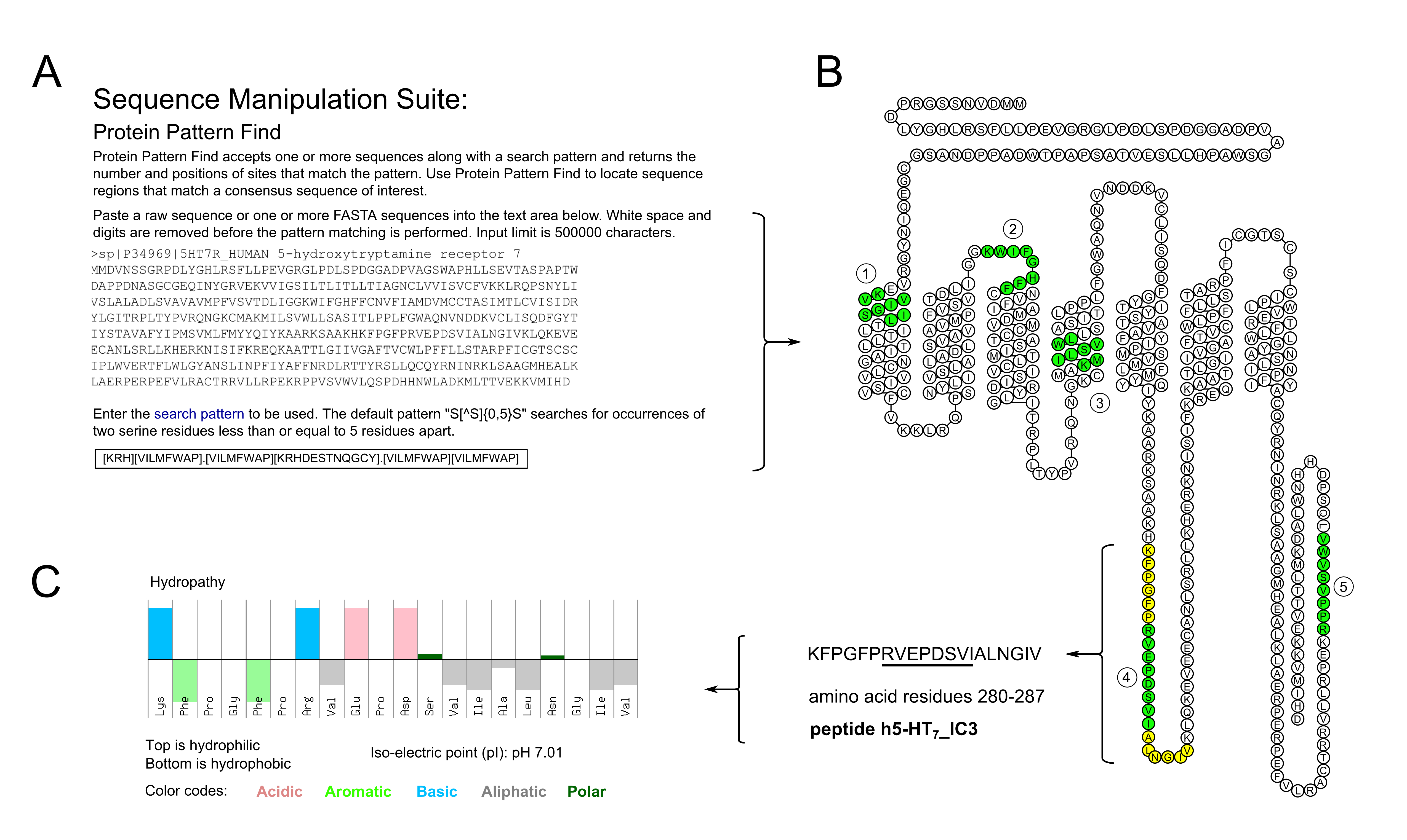Figure 1. Identification of putative S100B consensus motifs within the human 5-HT7 receptor and selection of a peptide from the third intracellular loop. A. Sequence analysis is used to identify putative consensus motifs. B. The motifs are mapped onto the topology of the target protein (see residues highlighted in green; spacers highlighted in yellow). Prior knowledge dictates which of the motifs are likely to be functionally relevant and guides the selection of peptides for further study. In the present case, five motifs exist overall but #4 (RVEPDSVI), located in the third intracellular loop (IC3) of the 5-HT7 protein, is prioritized based on prior knowledge of GPCR structure and function. C. Peptide property calculators are used to estimate physicochemical characteristics, such as isoelectric point and hydrophobicity of the peptide designed in this workflow.