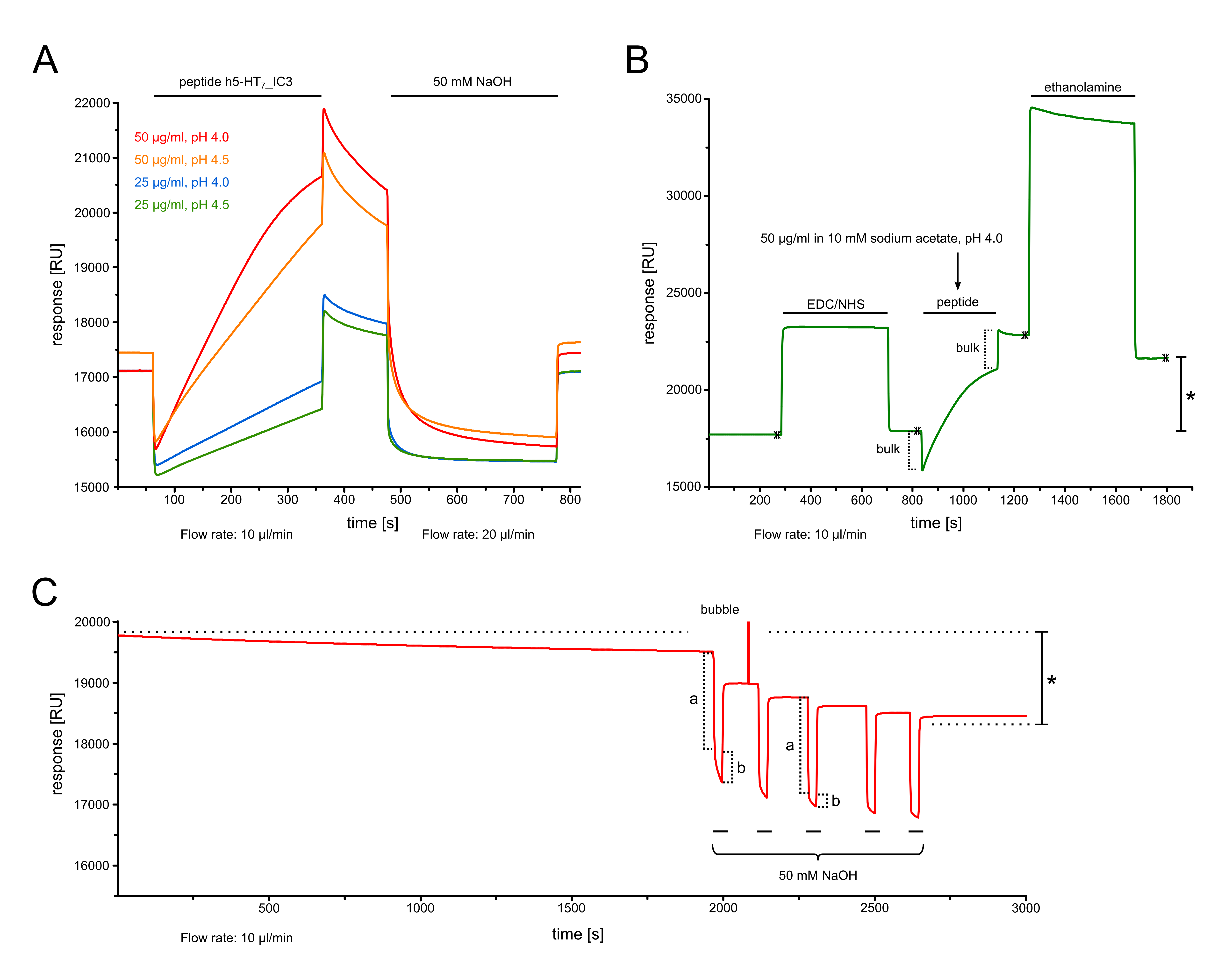 Figure 2. Pre-concentration, peptide immobilization and conditioning of the newly generated sensor surface. A. Peptide h5-HT7_IC3 is dissolved in immobilization buffer (10 mM sodium acetate) at various concentrations and pH values. Injections (black horizontal bars) over the CM5 chip reveal concentration- and pH-dependent electrostatic attraction (“pre-concentration”) to the negatively charged carboxymethylated dextran matrix on the chip surface. Notably, a sizable fraction of pre-concentrated h5-HT7_IC3 is retained at the surface, i.e. does not completely dissociate after injection (see period before injection of 50 mM NaOH). Also note the large bulk response, i.e. a sharp and sudden decrease in RU values upon peptide injection, which arises because the peptide is dissolved in DMSO. B. Immobilization of peptide (50 µg/ml in 10 mM sodium acetate, pH 4.0) occurs after activation of the chip surface with EDC/NHS. The surface is then deactivated with 1.0 M ethanolamine-HCl, pH 8.5. Note bulk response upon peptide injection, as expected from pre-concentration assays. Asterisk indicates the amount of peptide immobilized according to the Biacore software wizard. C. Conditioning of the sensor surface through injections of 50 mM NaOH (horizontal bars) and stabilization of baseline in running buffer overnight. Initially, the sensorgram slowly drifts towards lower RU values. Letters a and b indicate bulk responses to NaOH and removal of “pseudo-immobilized” peptide, respectively. Note how the extent of removal diminishes between injections 1-5. The distance between the two dotted horizontal lines (see asterisk) represents the difference between “apparent” (per the software wizard) and “true” amount of immobilized peptide. Towards the end of the observation period, the baseline is stable and horizontal, showing that the surface is now ready for use.