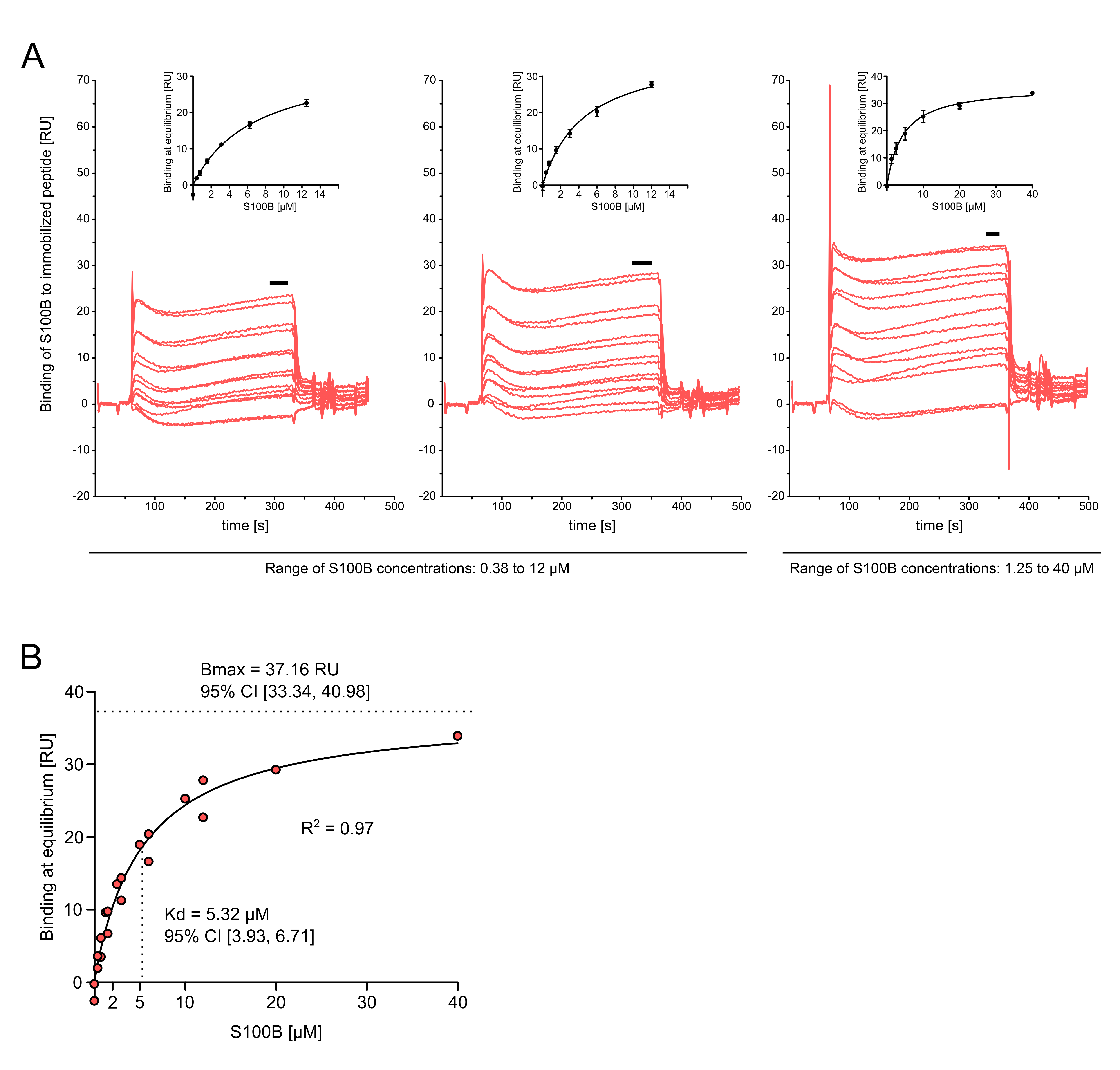 Figure 3. Sensorgrams reveal binding of S100B to peptide h5-HT7_IC3 and allow derivation of affinity estimates through equilibrium analysis and nonlinear regression. A. Three experiments were carried out with a CM5 chip to which h5-HT7_IC3 had been immobilized. Concentrations of S100B (in duplicate) ranged from 0.38 to 12 µM in the first two experiments (left and middle panel). Because curve fitting via nonlinear regression (see insets) indicated that saturation had not been reached, the concentration of S100B was increased from 1.25 to 40 µM in the third experiment (right panel). Note that the fitted curve now more closely approaches saturation. Black horizontal bars indicate those parts of the sensorgrams from which steady-state data (binding response at equilibrium, in response units [RU]) were derived. B. Data from the three experiments were summarized by plotting the binding responses at equilibrium against the concentrations of S100B and fitting a one-site binding model. Each point represents averaged duplicates from a given experiment. The affinity of interaction (dissociation constant, Kd) and maximal binding capacity of the sensor surface (Bmax) were derived and are listed with 95% confidence intervals (CI). The R2 value indicates goodness of fit for the one-site binding model.